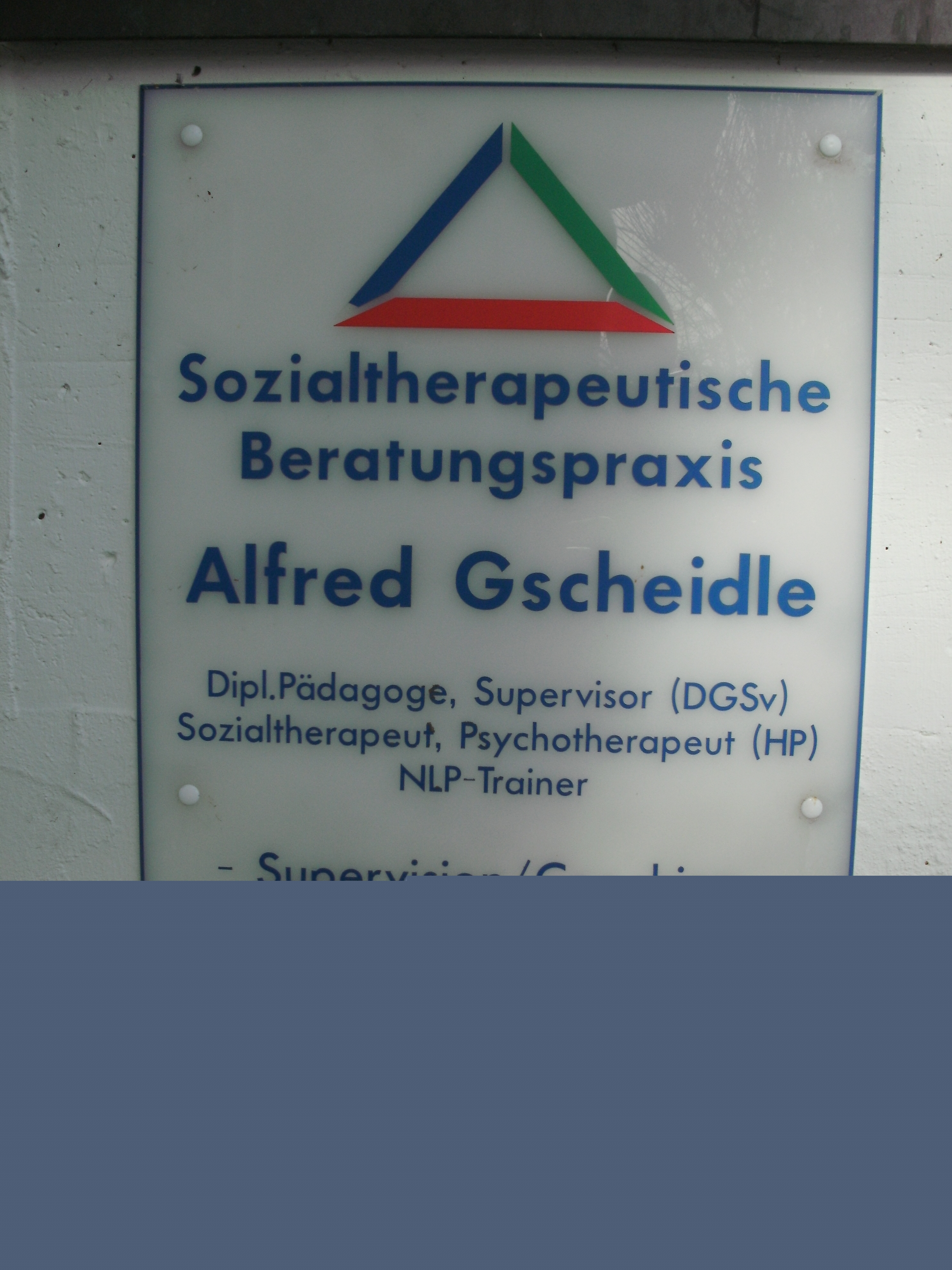 Sozialtherapeutische BeratungspraxisAlfred Gscheidle Schlierbacherstr. 39, 73230 Kirchheim unter TeckTel.: + 49 (0) 70 21 - 7366590 (geschäftl.) - 736288 (privat);Fax: + 49 (0) 70 21 - 7366591E-Mail: info@alfred-gscheidle.de